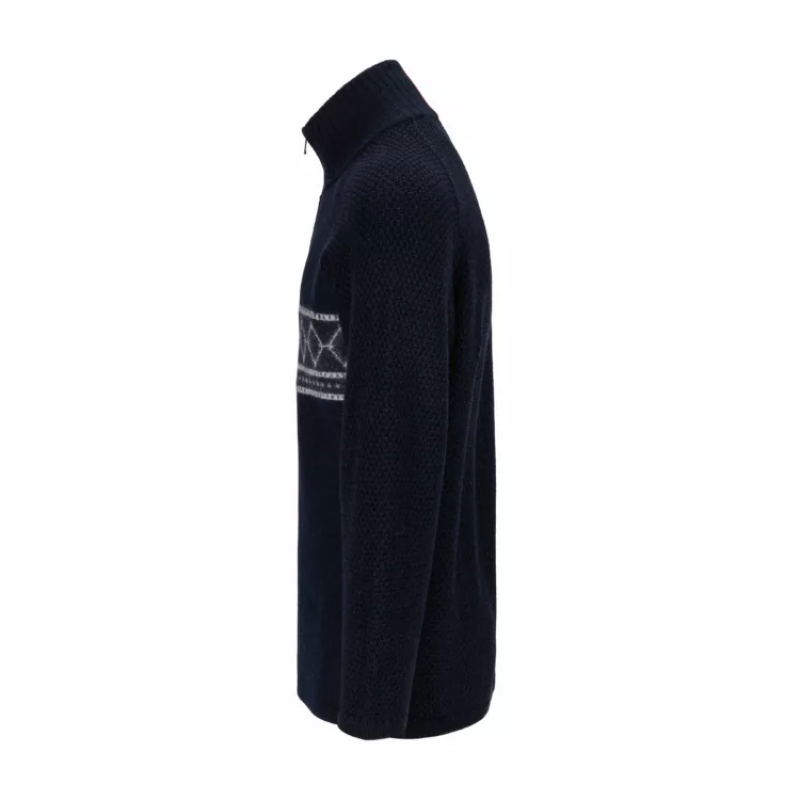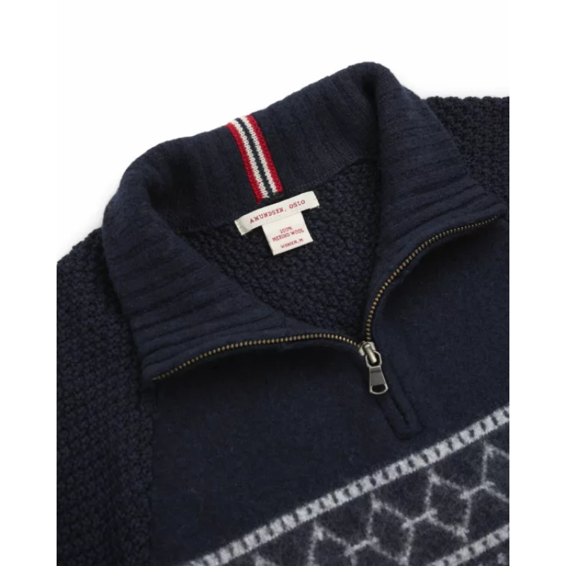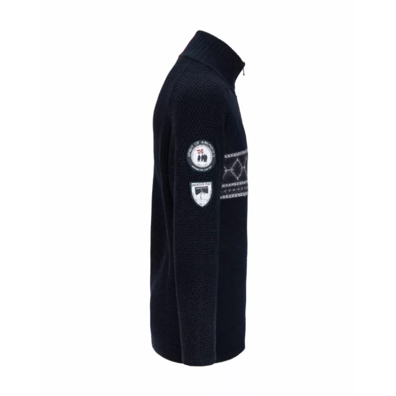 Denne genseren er laget av 100 % kokt merinoull, og er strategisk sydd for å gi en tett varm strikk foran og en løsere «mosesøm» på armer og bak for bevegelighet. Selvfølgelig har vi stolt et tradisjonelt nordisk mønster over brystet.