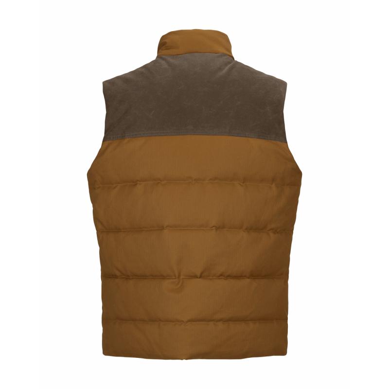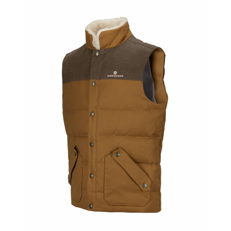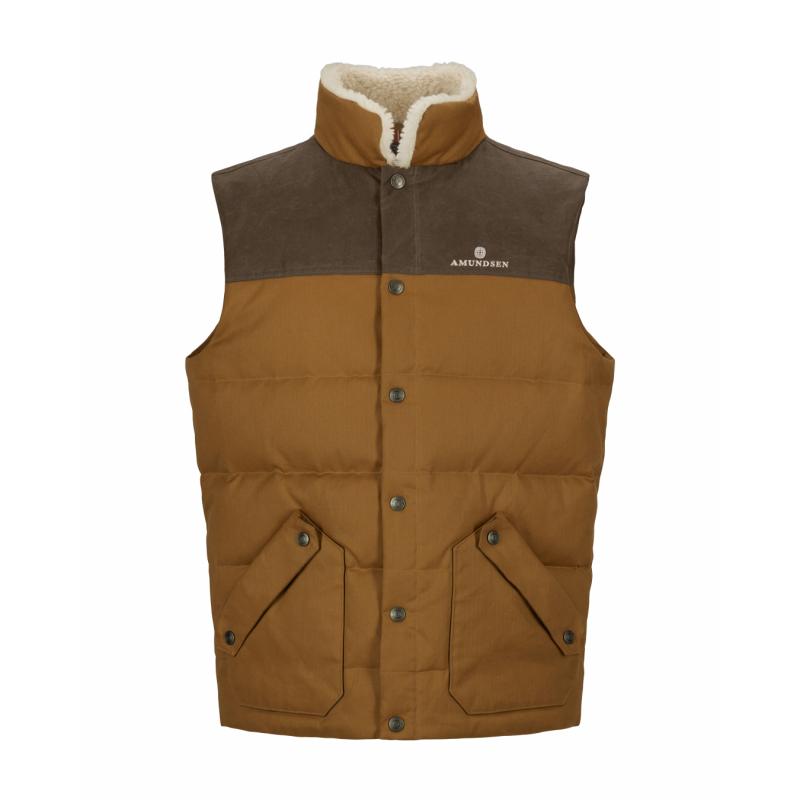 Denne hovne vesten i resirkulert dun og robust vokset fiskebensbomull gir førsteklasses varme. Foran på plagget har to lappede håndvarmende lommer, med en polar fleece-fôret krage for ultimat komfort.