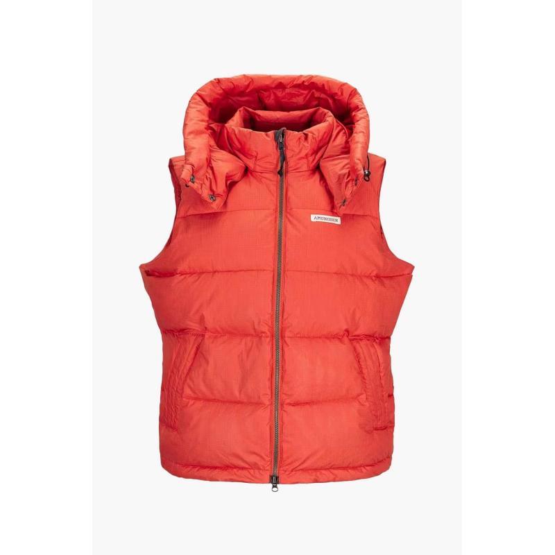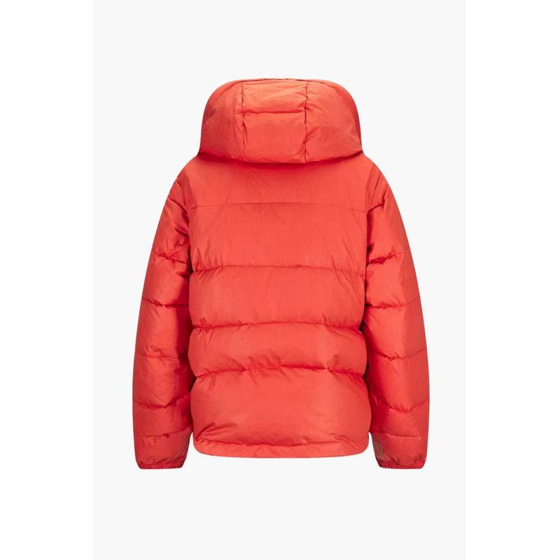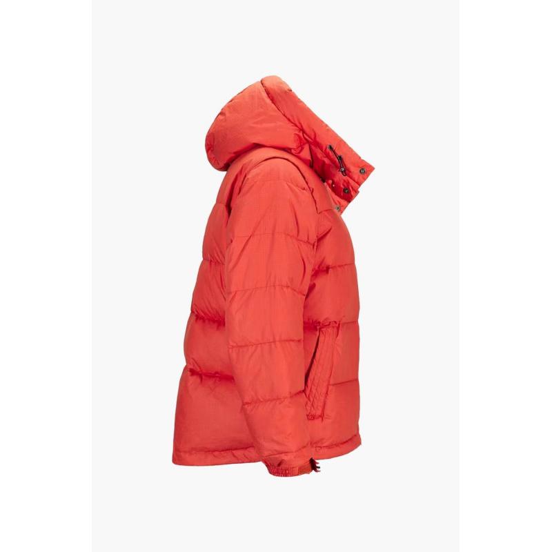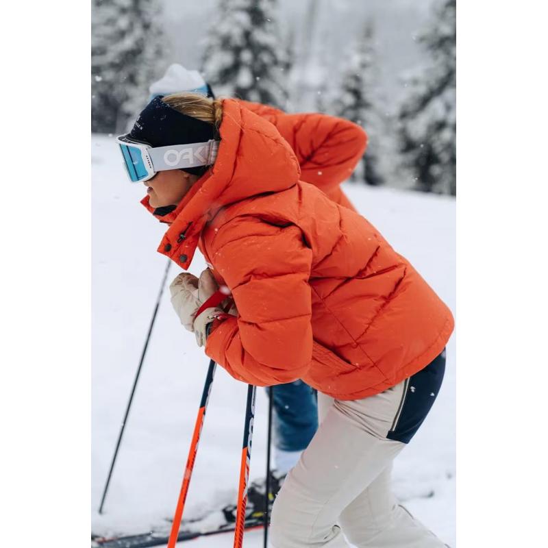 Midjeskåret tykk resirkulert dunjakke i økologisk bomull. Avtakbare ermer for høytrykksdagene i løypa.