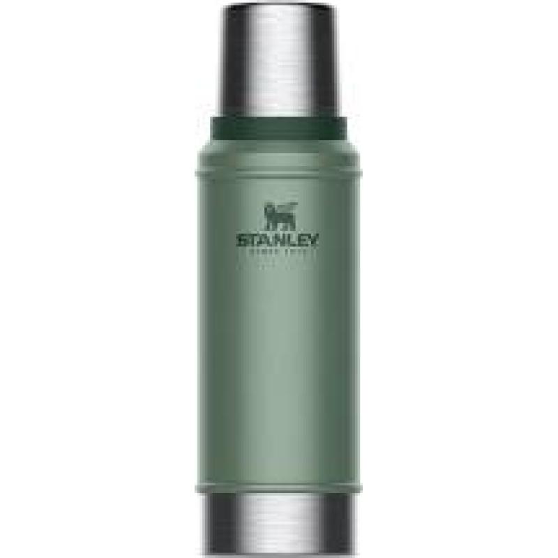 Dette er en solid. klassisk termos med praktisk skrukork. Termosen rommer 0.75 liter. og passer fint både på tur. skole og arbeid. Korken er lett å skru på. og er garantert lekkasjefri slik at du trygt kan ha den i sekken. Den medfølgende koppen er dobbeltisolert. Termosen holder innholdet varmt eller kaldt i 20 timer. Hele koppen kan vaskes i oppvaskmaskin. Termosen er laget i kraftig rustfritt stål. og er naturlig BPA- fri. Volum: 0.75 liter. Termosen kommer i klassisk Stanley – grønn (Hammertone Green).